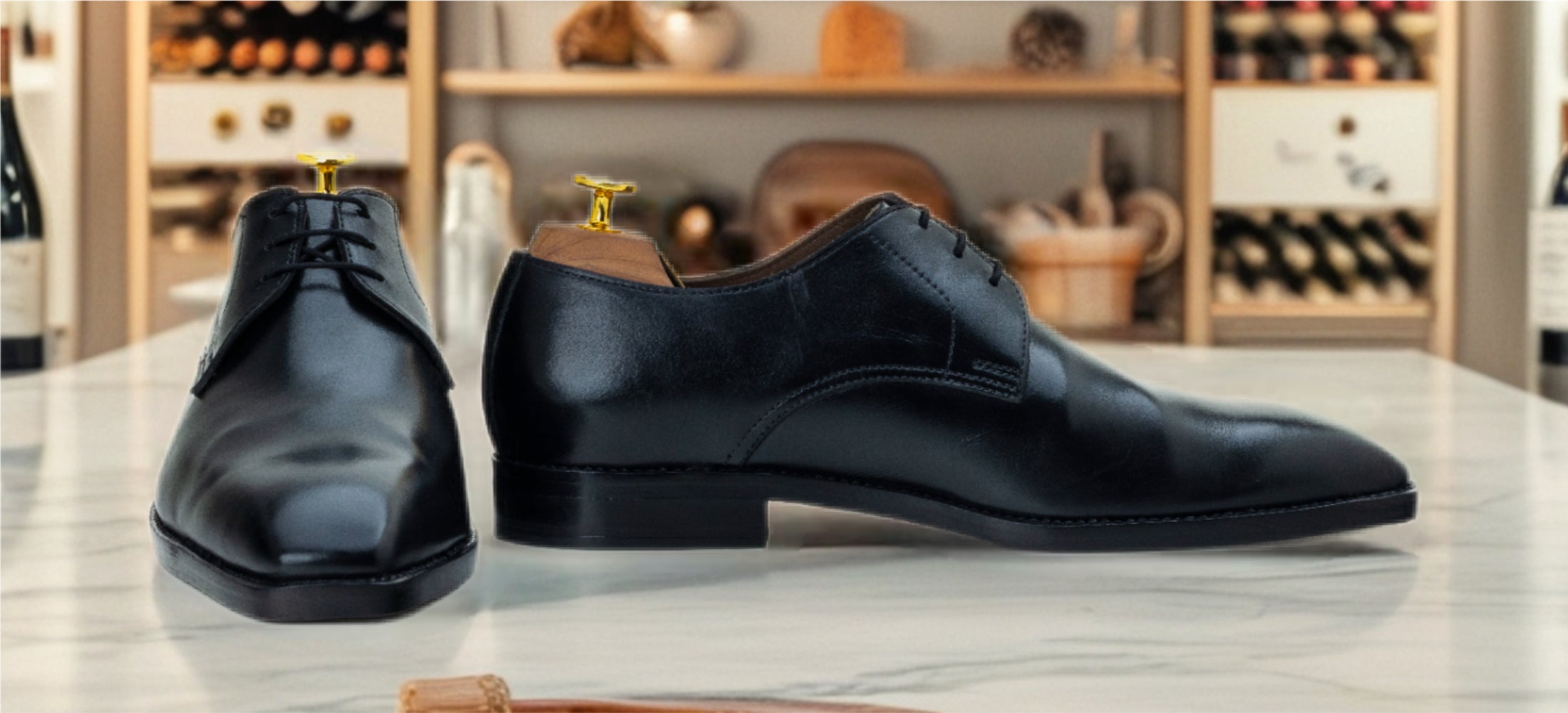 The Alarick | Black Leather Derby is a handcrafted Derby shoe crafted from premium European black calf leather with a sharp chisel almond toe. Featuring a Goodyear welted leather sole, a soft calf leather lining, and a three-eyelet lace-up design with closer heel clipping and narrower waist for arch support, these Derbys blend timeless style with lasting comfort, ideal for formal and casual settings.