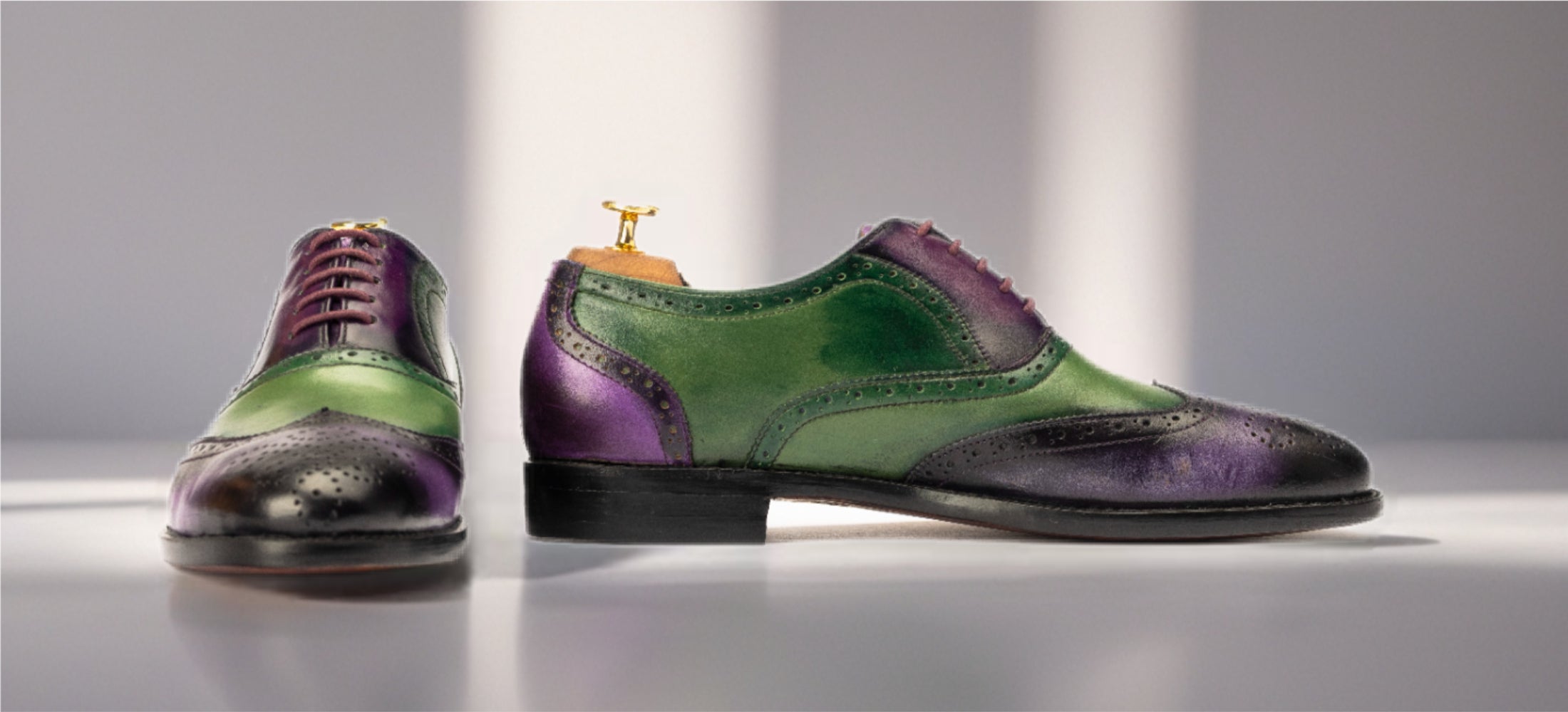 Make a bold impression with The Bowen, a striking wingtip Oxford handcrafted from 100% premium calf leather. Featuring a unique hand-painted patina in rich purple and green tones, this shoe is the perfect blend of classic design and modern flair. Fully lined with soft calf leather for comfort, and built on a durable Goodyear welted sole, The Bowen is made for the discerning gentleman who appreciates true craftsmanship and standout style.