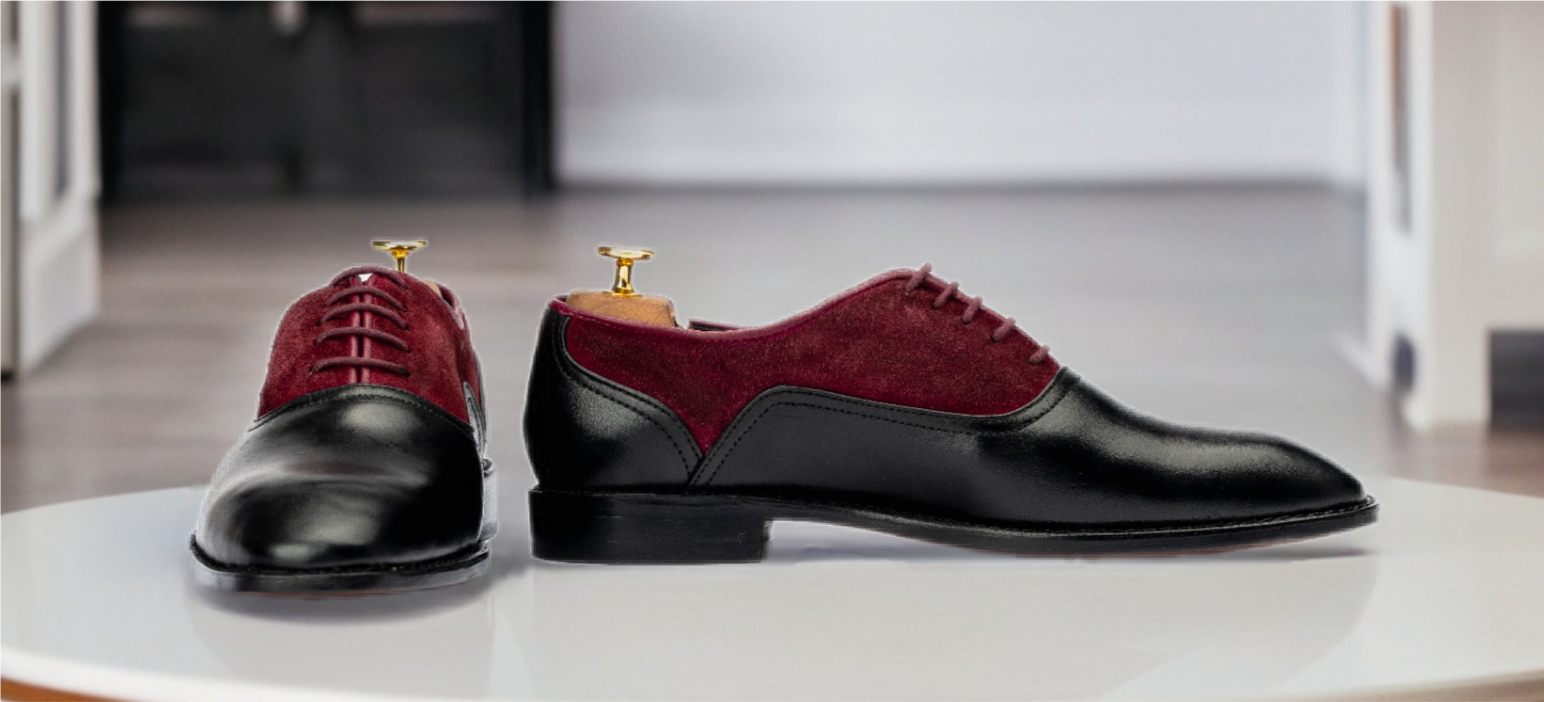 A bold blend of maroon calf leather and black suede, The Brant is a handcrafted Oxford that balances timeless elegance with contemporary flair. Featuring a brogue toe, Goodyear welted sole, and leather-wrapped laces, it’s built for both sophistication and comfort. Perfect for formal events or standout business attire.