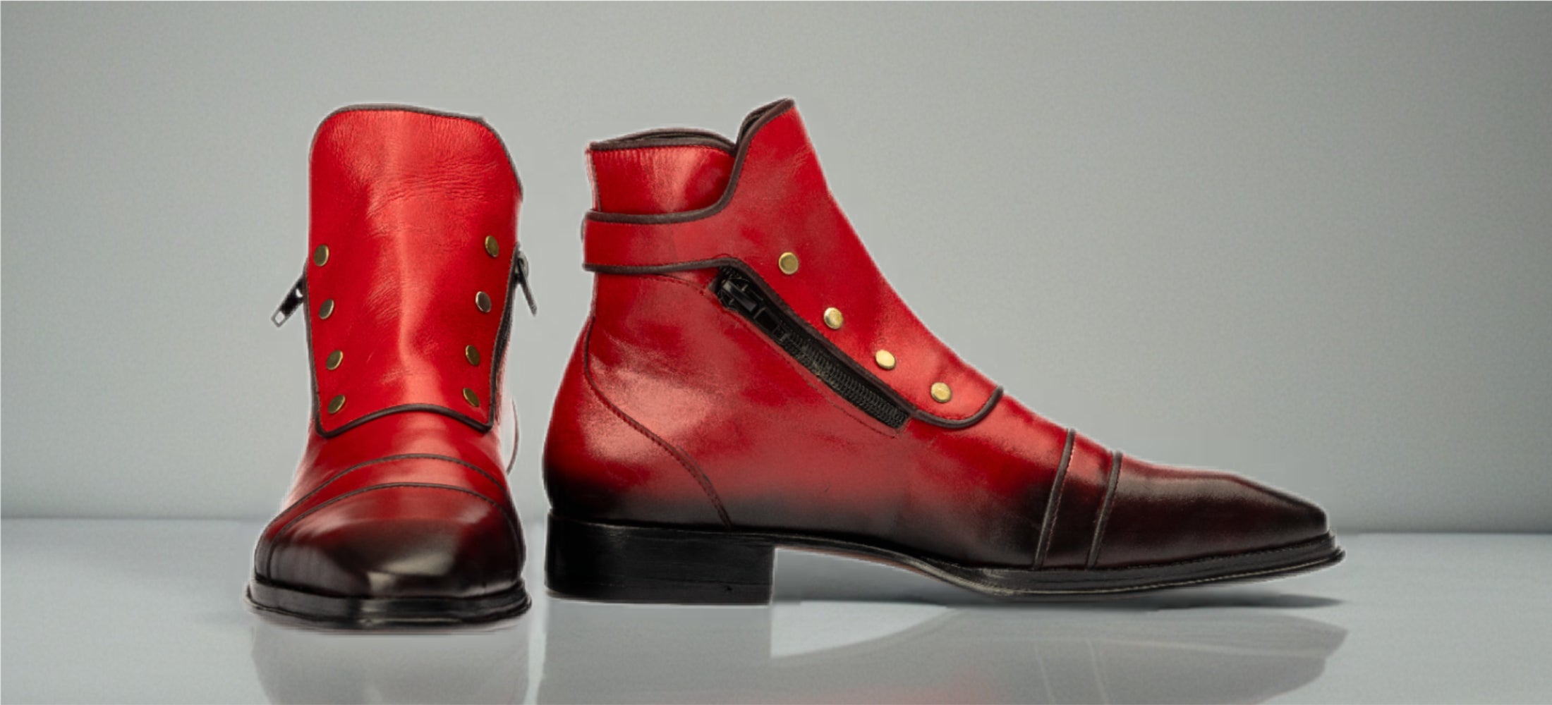 Inspired by classic military silhouettes and reimagined for the modern gentleman, The Fenric stands tall as a statement piece. Its side-zipper design offers convenience, while the monk strap with detailed buttons adds character and structure. With an ankle-high profile and almond toe shape, this boot walks the line between heritage and rebellion. The hand-painted red patina is intentionally rich and layered—never loud, always powerful.