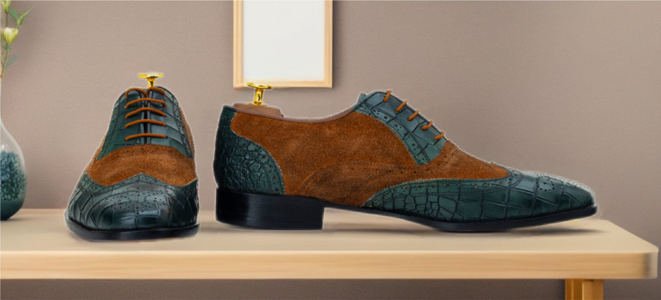 The Greer is a masterclass in material fusion, blending deep green crocodile-embossed calfskin with rich brown suede to create a truly distinctive Oxford. Each leather component is carefully sourced from the finest hides, ensuring exceptional quality, durability, and a luxurious hand feel. The inner lining and sole are crafted from 100% genuine soft calf leather, offering unmatched comfort and breathability. This premium leather selection guarantees that every pair of Greer shoes ages beautifully, developing a unique patina that tells your story with every wear.