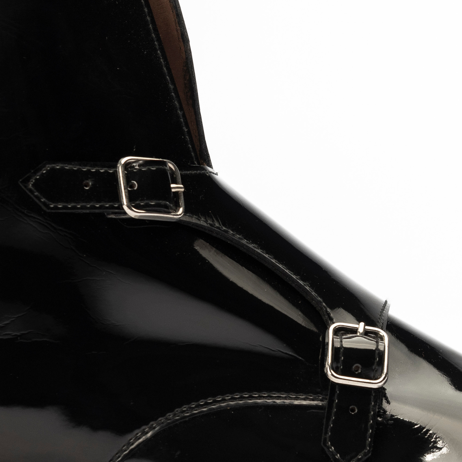 The Kaelric is a handcrafted double monk strap ankle boot, made from polished black calf leather and lined with soft calfskin for all-day comfort. Featuring an almond toe and Goodyear welted leather sole with a stacked leather and wood heel, it's a sophisticated, durable, and versatile choice for modern formal wear or smart casual styling.