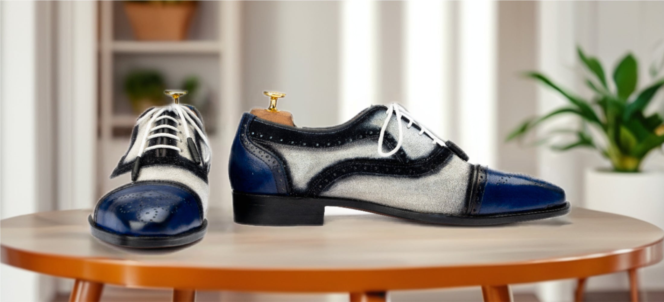 The Lorien is where elegance meets edge—a masterpiece crafted from a rare fusion of navy suede and beige hand-painted calfskin. At the toe and heel, deep navy leather adds a refined touch, while the midsection features a smooth transition into light suede for contrast and character. The leather is carefully antiqued and treated by hand, creating a subtle patina that feels as rich as it looks. Inside, it’s lined with 100% soft calf leather, ensuring breathability and long-lasting comfort with every step. This is leather that tells a story—and only gets better with age.