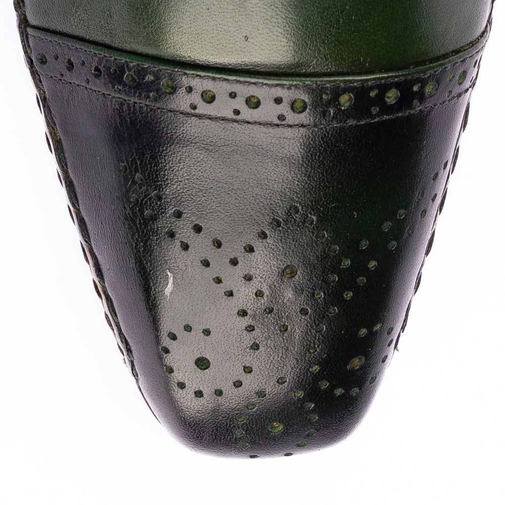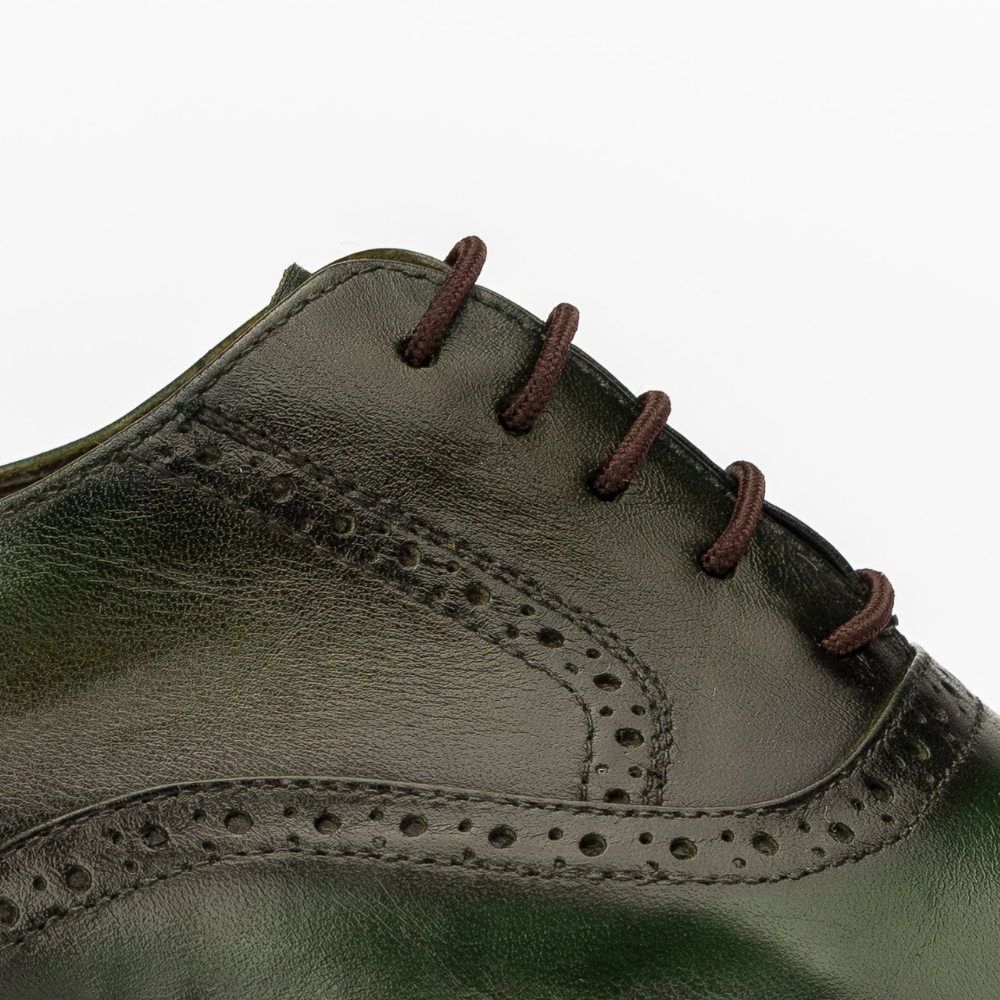 The Nesbit is a handcrafted green patina Oxford featuring a brogue-style calf leather upper, Goodyear welted sole, and soft calfskin lining—designed for bold, refined men.