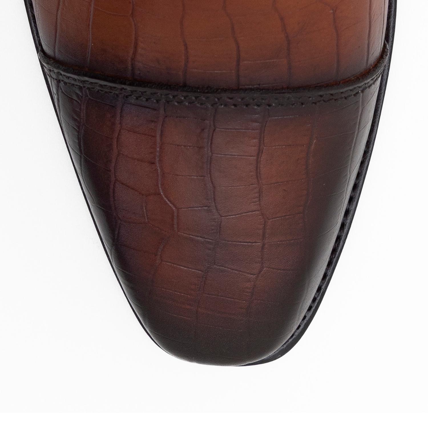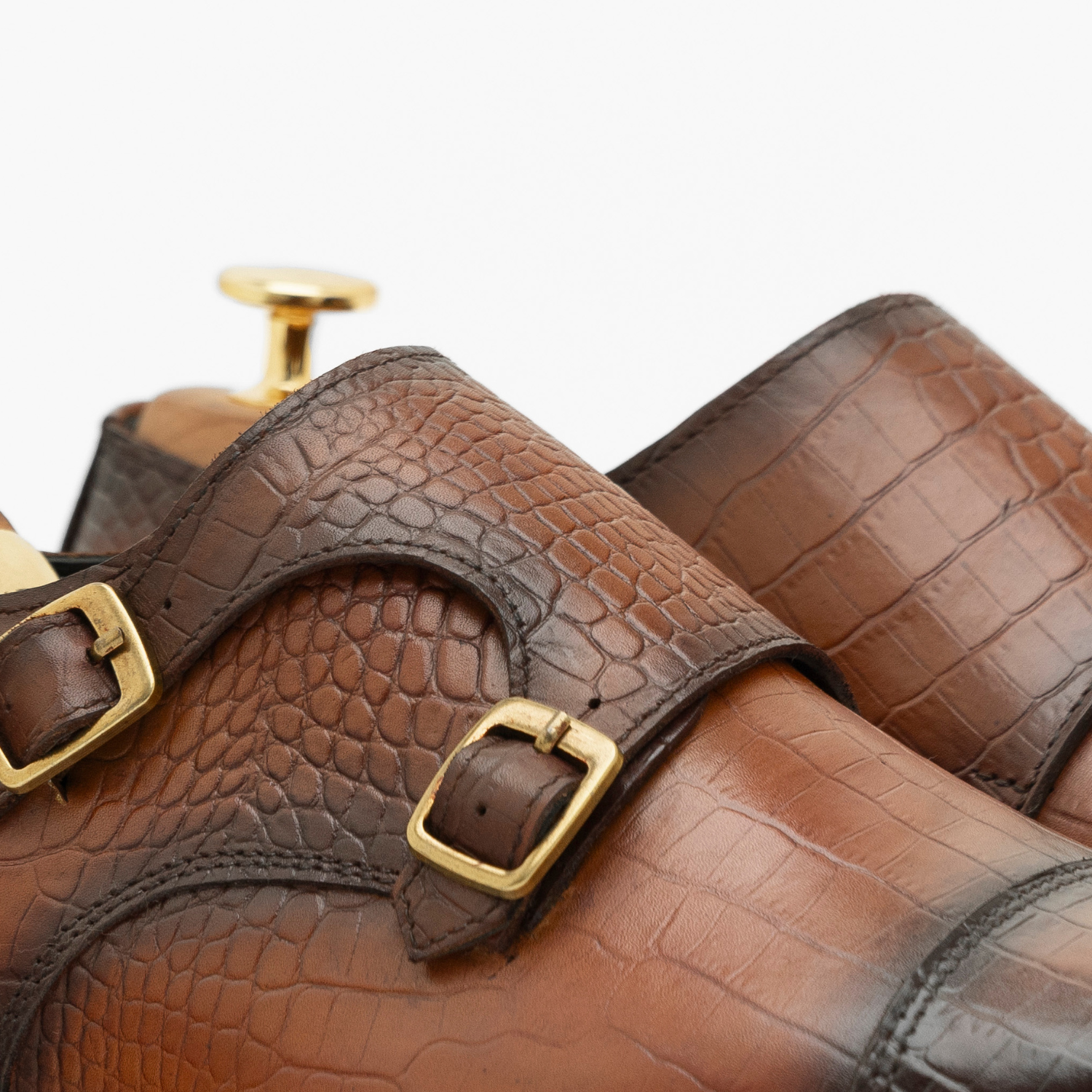 The Olander is a handcrafted double monk strap shoe featuring brown crocodile-embossed calfskin leather, Goodyear welted sole, and a rich Bordeaux-and-black leather lining. Elegant, bold, and built to last.