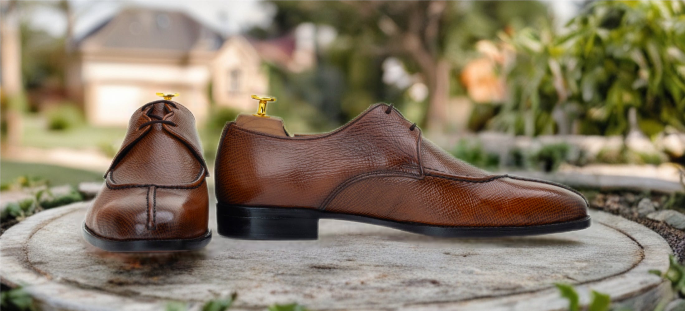 The Quinton redefines the Derby with its bold lace-up design, showcasing a striking split toe and a slip square toe silhouette that exudes rugged sophistication. The brown hand-painted embossed leather upper, meticulously handcrafted by artisan hands, blends timeless charm with modern flair, its 2-eyelet closure adding a touch of heritage elegance. Hand-stitched with the artistry of skilled craftsmen, The Quinton is a masterpiece that beckons the discerning gentleman to embrace its unparalleled style.