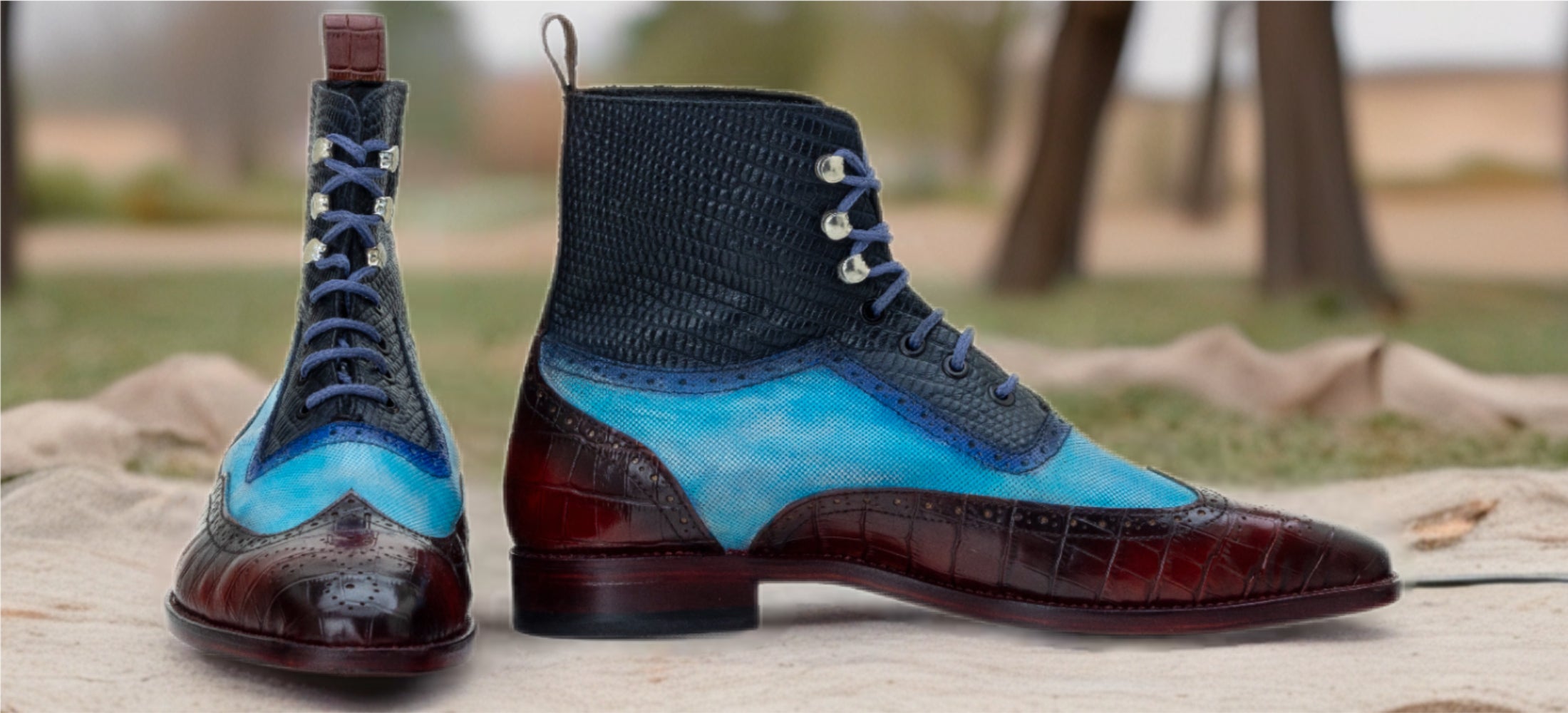 At the core of The Roald lies an artistic expression of leatherwork rarely seen in modern footwear. This statement-making boot fuses three distinct finishes: a deep purple crocodile-embossed calfskin, a lightly burnished sky-blue leather, and a navy croco-texture overlay — all hand-selected, hand-painted, and hand-stitched by master artisans. Every inch of this boot speaks of intention. Inside, a full lining of genuine soft calf leather offers breathable comfort and luxury with every step. Leathry sources only the finest materials, ensuring a one-of-a-kind finish that tells your story before you do.