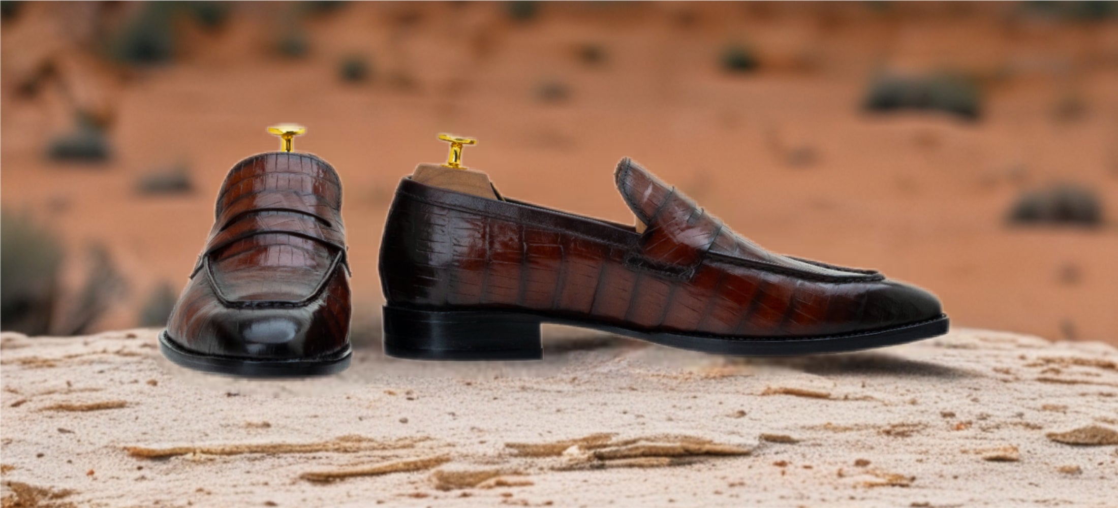 The Royce redefines the classic moccasin loafer with its seamless slip-on design and refined square almond toe, blending modern elegance with timeless appeal. The deep brown alligator texture, meticulously hand-polished, adds an exotic sophistication that commands attention, while the leather-and-wood stacked heel provides a subtle lift for a polished silhouette. Hand-stitched over 5 days, this loafer combines heritage craftsmanship with a bold, contemporary edge, making it the perfect choice for the discerning gentleman who values distinctive style.