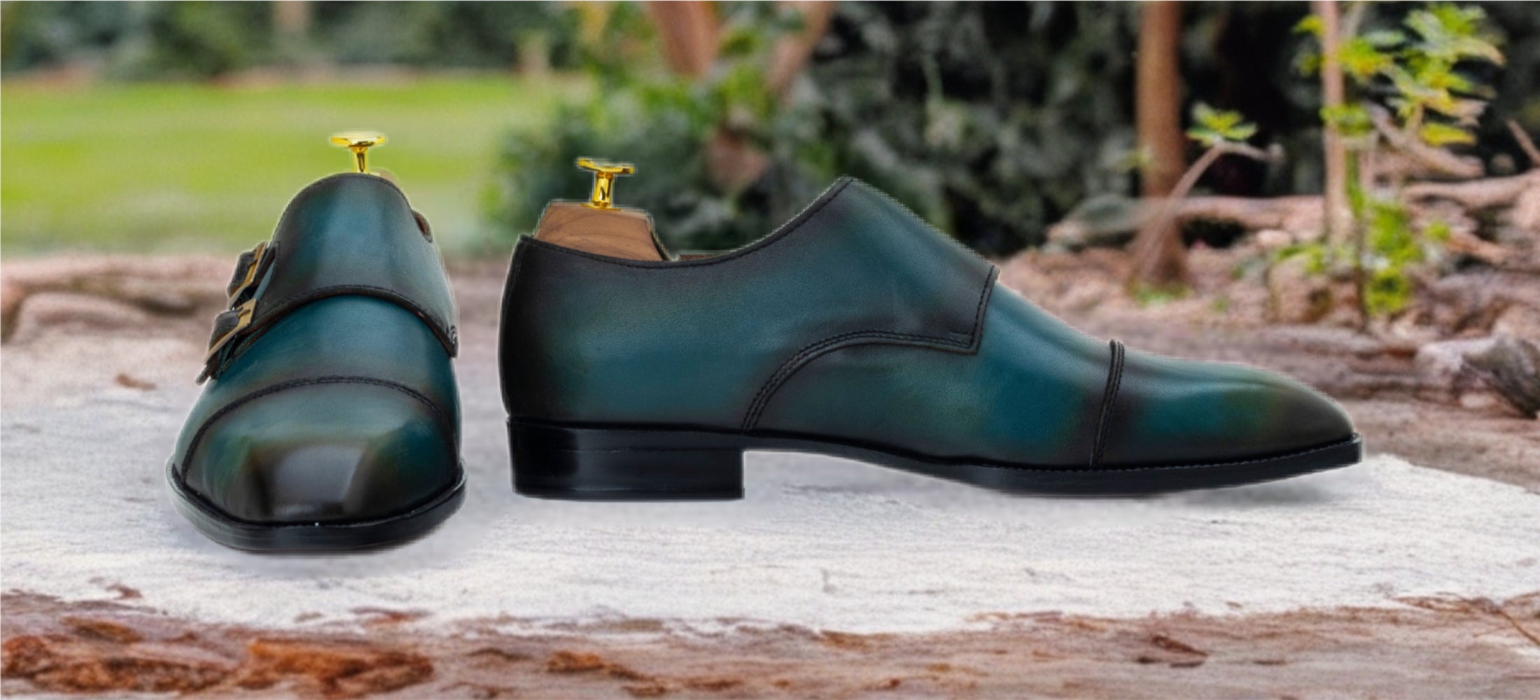 The Xandor | Turquoise Double Monk Strap boots combine artisanal craftsmanship with bold style. Hand-painted in a striking turquoise and green patina on genuine calf leather, these boots feature a pointed almond toe and classic double monk strap closure. Built on a durable Goodyear welted leather sole with a stacked leather and wood heel, they offer exceptional comfort and lasting quality. Perfect for elevating both formal and casual looks.