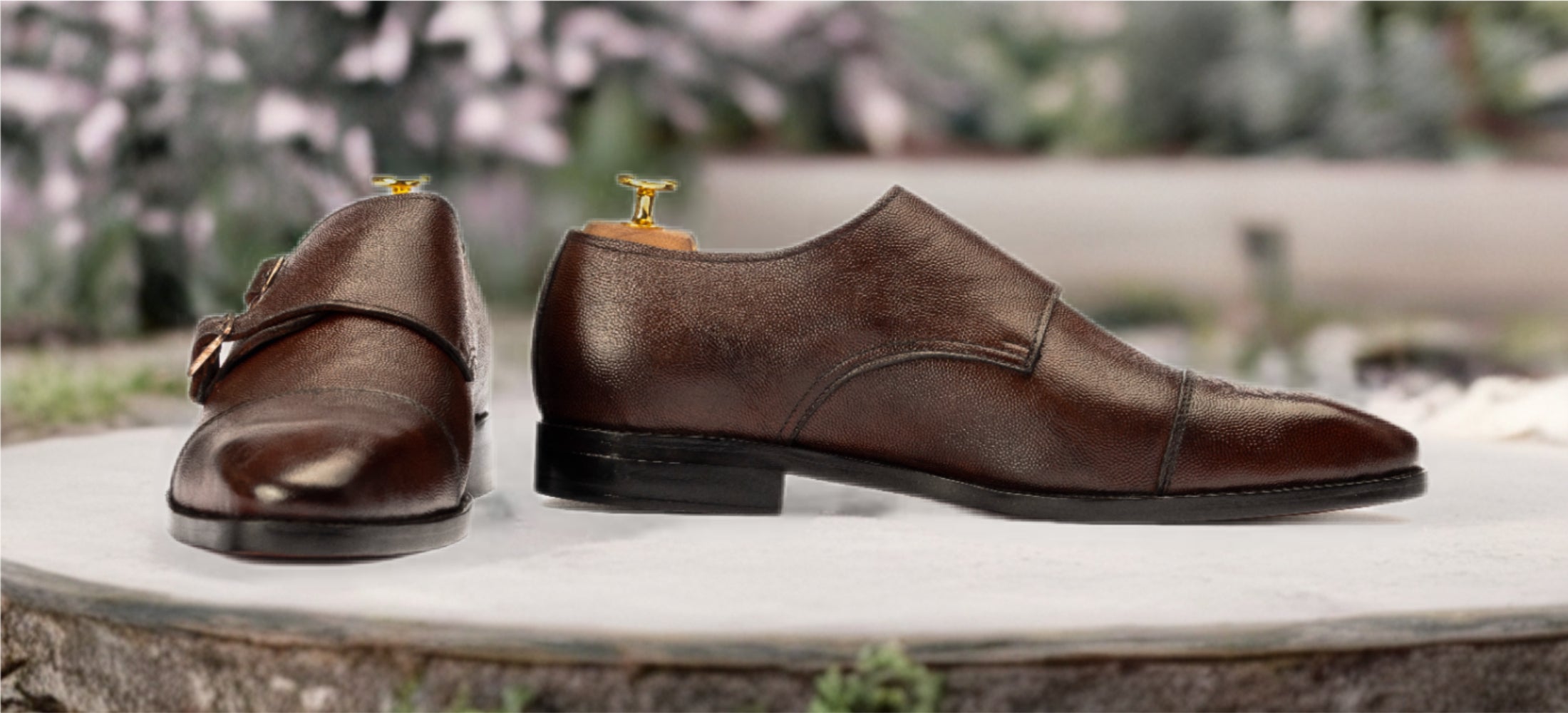 Bold, refined, and built to last—The Xeno is a handcrafted double monk strap shoe made from rich dark brown pebble grain calf leather. With a Goodyear welted sole, leather & wood stacked heel, and timeless monk design, it’s where rugged texture meets luxury sophistication.
